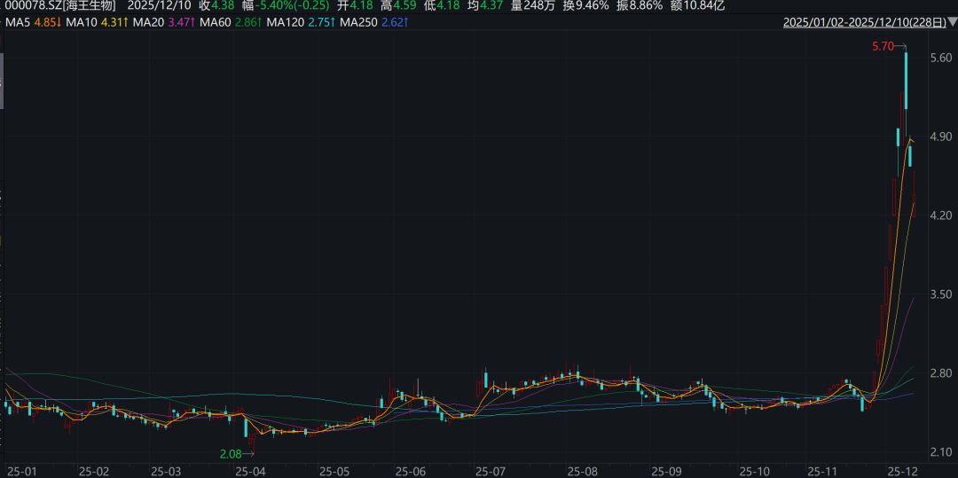 自今年11月末起,海王生物(000078)(000078.SZ)在二级市场掀起一股强劲上涨行情。截至12月5日收盘,该股八个交易日内收获七个涨停板,累计涨幅偏离值超过100%。
