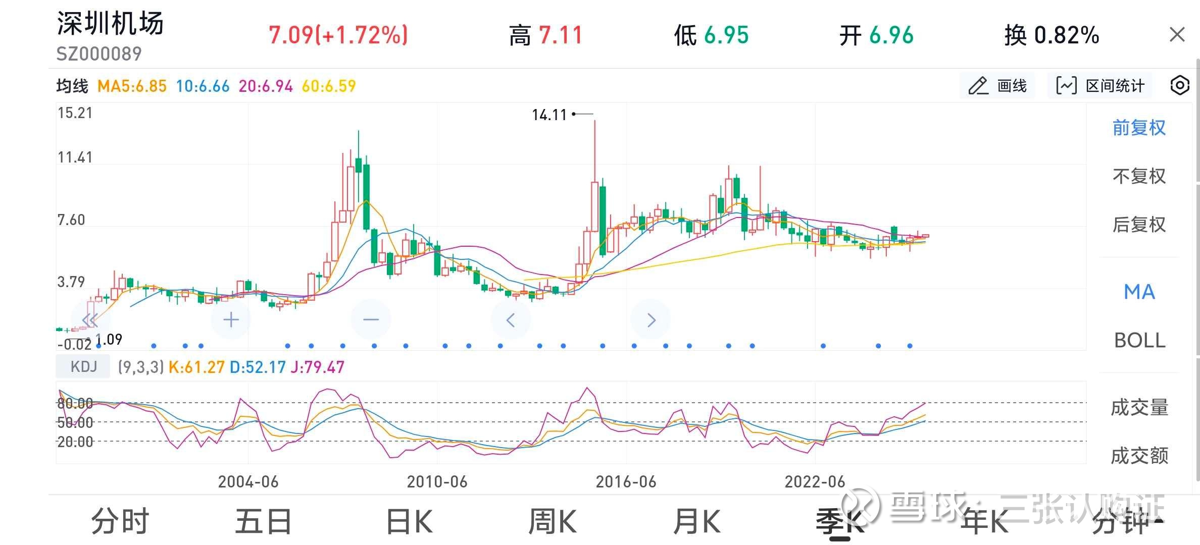 再来看看深圳机场的季K线目前所处位置,国庆客运货运数据也验证了前面对于基本面的判断,很容易推出后续一年深圳机场至少有50%的涨幅,当然和科技股的暴涨无法相比,但胜在稳。