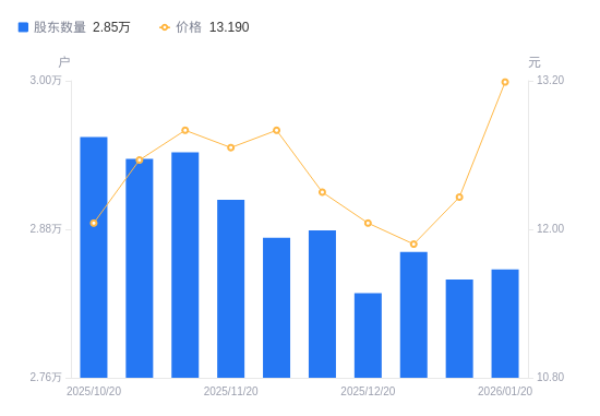 近一年(2025年1月20日至2026年1月20日),中成股份A股股东户数从3.03万户,减低至2.85万户,降幅6.15%,区间股价下跌3.09%。