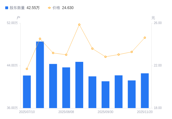 近一年(2024年10月31日至2025年10月20日),常山北明A股股东户数从63.62万户,减低至46.53万户,降幅26.86%,区间股价下跌25.36%。