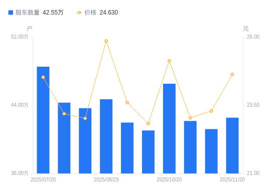 近一年(2024年11月29日至2025年11月28日),常山北明A股股东户数从50.8万户,减低至41.26万户,降幅18.80%,区间股价下跌18.40%。