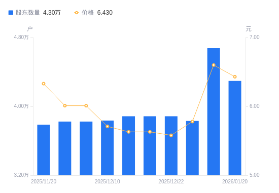近一年(2025年1月20日至2026年1月20日),国际实业A股股东户数从3.94万户,增加至4.3万户,增幅9.13%,区间股价上涨18.85%。