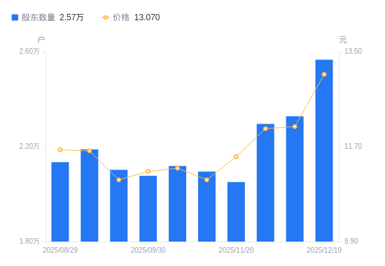 12月22日消息,数据显示,截至2025年12月10日,英特集团A股股东总户数为2.33万户,较上期(2025年11月28日)增加321户,增幅1.40%。公司最新A股总股本为5.22亿股,其中流通A股3.23亿股,户均持有流通A股数量为1.39万股,较上期减少183.55股,降幅1.31%;户均持流通A股市值16.77万元,较上期减少1654.81元,降幅0.98%。