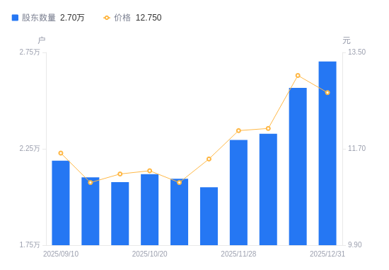 1月12日消息,数据显示,截至2025年12月31日,英特集团A股股东总户数为2.7万户,较上期(2025年12月19日)增加1374户,增幅5.35%。公司最新A股总股本为5.41亿股,其中流通A股3.44亿股,户均持有流通A股数量为1.27万股,较上期增加118.92股,增幅0.94%;户均持流通A股市值16.2万元,较上期减少2512.1元,降幅1.53%。