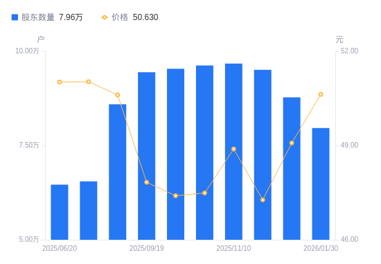 2月9日消息,数据显示,截至2026年1月30日,东阿阿胶A股股东总户数为7.96万户,较上期(2025年12月31日)减少8122户,降幅9.25%。公司最新A股总股本为6.44亿股,其中流通A股6.43亿股,户均持有流通A股数量为8073.96股,较上期增加747.2股,增幅10.20%;户均持流通A股市值40.88万元,较上期增加4.92万元,增幅13.68%。