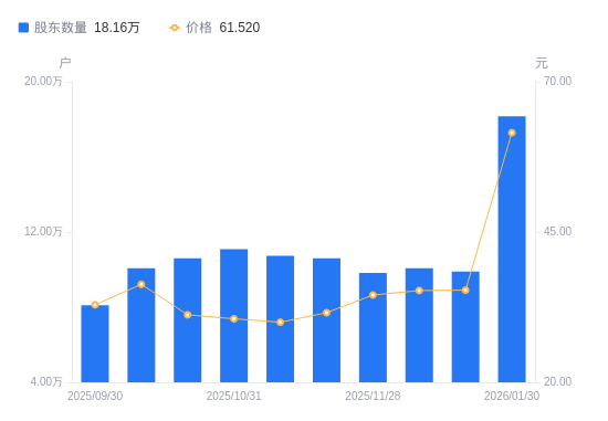 2月3日消息,数据显示,截至2026年1月30日,兴业银锡A股股东总户数为18.16万户,较上期(2025年12月19日)增加8.27万户,增幅83.67%。公司最新A股总股本为17.76亿股,其中流通A股17.75亿股,户均持有流通A股数量为9772.78股,较上期减少8176.72股,降幅45.55%;户均持流通A股市值60.12万元,较上期减少3.29万元,降幅5.19%。