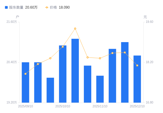 近一年(2024年12月10日至2025年12月10日),中兵红箭A股股东户数从17.1万户,增加至20.6万户,增幅20.47%,区间股价上涨11.87%。
