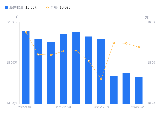 近一年(2025年2月10日至2026年2月10日),中兵红箭A股股东户数从16.1万户,增加至16.6万户,增幅3.11%,区间股价上涨29.61%。