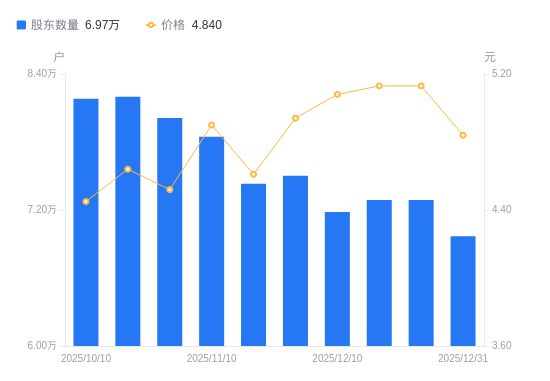 1月5日消息,数据显示,截至2025年12月31日,凤凰航运A股股东总户数为6.97万户,较上期(2025年12月21日)减少3199户,降幅4.39%。公司最新A股总股本为10.12亿股,其中流通A股10.12亿股,户均持有流通A股数量为1.45万股,较上期增加637.42股,增幅4.59%;户均持流通A股市值7.03万元,较上期减少941.75元,降幅1.32%。