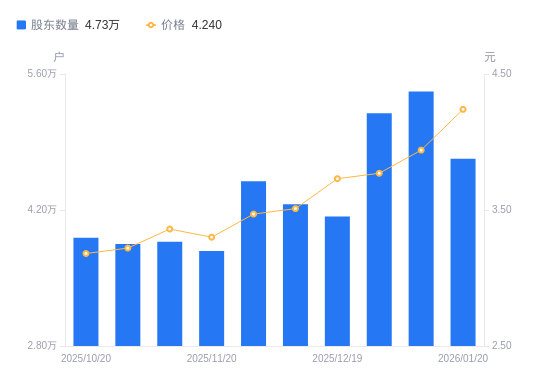 1月30日消息,数据显示,截至2025年12月31日,红棉股份A股股东总户数为5.2万户,较上期(2025年12月19日)增加1.06万户,增幅25.72%。公司最新A股总股本为18.35亿股,其中流通A股13.25亿股,户均持有流通A股数量为2.55万股,较上期减少6558.43股,降幅20.46%;户均持流通A股市值9.61万元,较上期减少2.34万元,降幅19.61%。