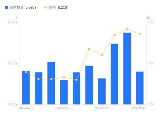 2月12日消息,数据显示,截至2025年12月31日,皖能电力A股股东总户数为5.78万户,较上期(2025年12月19日)增加2033户,增幅3.64%。公司最新A股总股本为22.67亿股,其中流通A股22.67亿股,户均持有流通A股数量为3.92万股,较上期减少1428.08股,降幅3.52%;户均持流通A股市值31.16万元,较上期减少2.19万元,降幅6.57%。