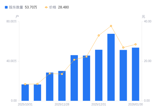 近一年(2025年2月10日至2026年1月30日),航天发展A股股东户数从15.26万户,增加至53.7万户,增幅251.84%,区间股价上涨296.66%。