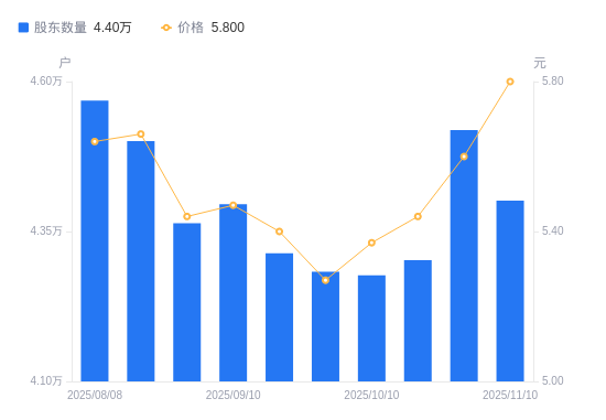 近一年(2024年11月20日至2025年11月10日),湖南投资A股股东户数从4.82万户,减低至4.4万户,降幅8.70%,区间股价上涨13.73%。