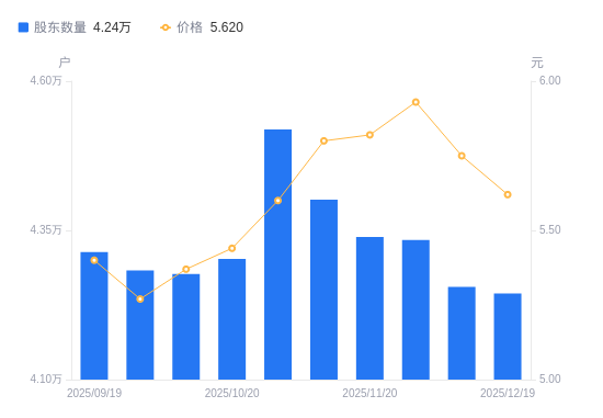 近一年(2024年12月20日至2025年12月19日),湖南投资A股股东户数从5.01万户,减低至4.24万户,降幅15.37%,区间股价上涨1.26%。