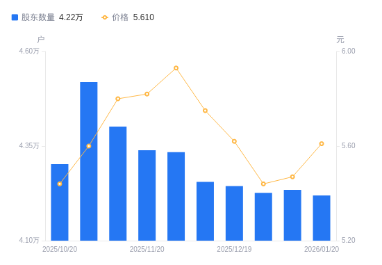 近一年(2025年1月20日至2026年1月20日),湖南投资A股股东户数从4.94万户,减低至4.22万户,降幅14.61%,区间股价上涨9.78%。