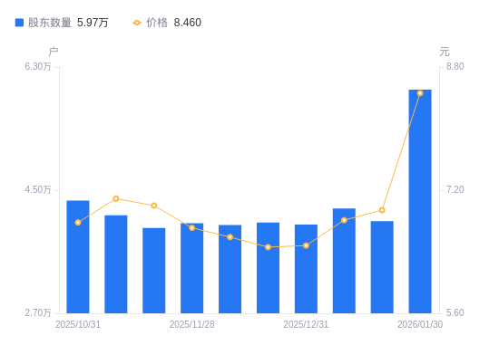 近一年(2025年2月10日至2026年1月30日),泰山石油A股股东户数从3.69万户,增加至5.97万户,增幅61.81%,区间股价上涨45.51%。