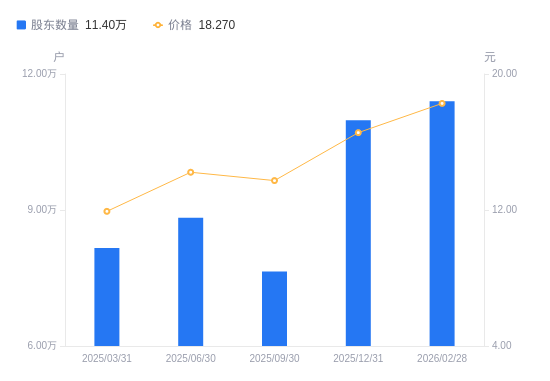 近一年(2025年2月28日至2026年2月28日),神州信息A股股东户数从7.37万户,增加至11.4万户,增幅54.63%,区间股价上涨41.41%。