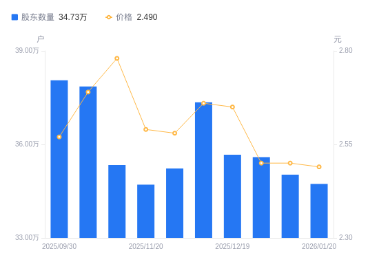 近一年(2025年2月10日至2026年1月30日),供销大集A股股东户数从34.4万户,减低至34.11万户,降幅0.84%,区间股价下跌9.33%。
