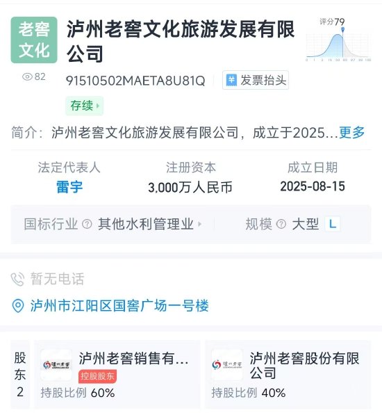近日,泸州老窖文化旅游发展有限公司成立,注册资本3000万元,经营范围包含服务消费机器人销售、化妆品批发、商业综合体管理服务、酒店管理等。天眼查股权穿透显示,该公司由泸州老窖销售有限公司与泸州老窖股份有限公司分别持股60%、40%。