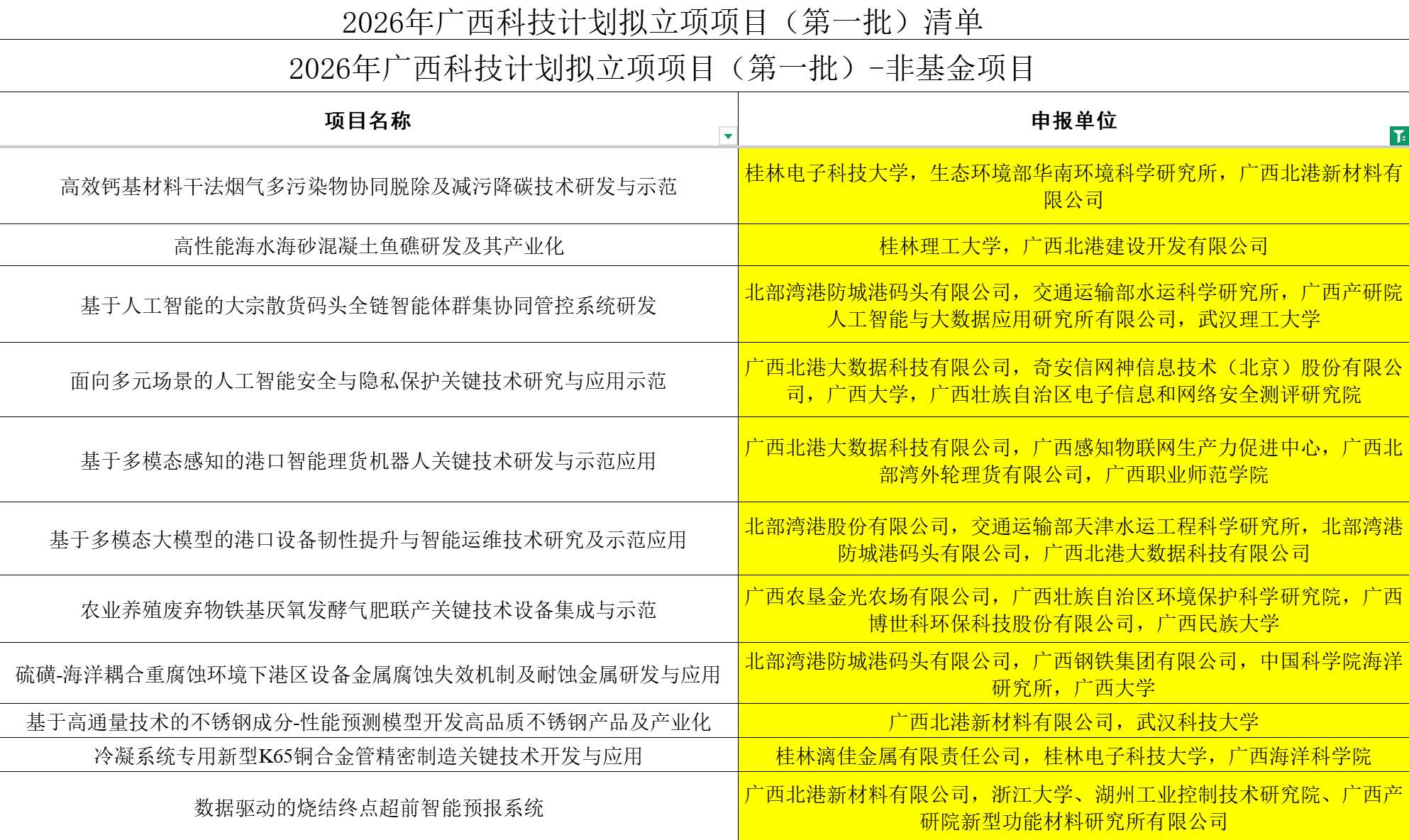 近日,自治区科技厅公布了2026年第一批广西科技计划拟立项项目的公示清单,北部湾港(000582)集团共有8家单位11个项目入选,标志着北部湾港集团在关键技术创新与产业化应用领域再获重要认可。