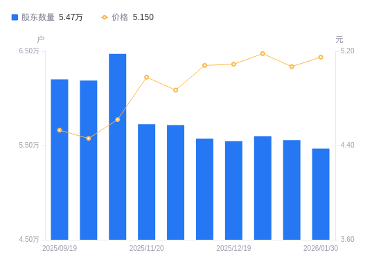 近一年(2025年2月28日至2026年1月30日),贵州轮胎A股股东户数从6.64万户,减低至5.47万户,降幅17.73%,区间股价上涨10.25%。