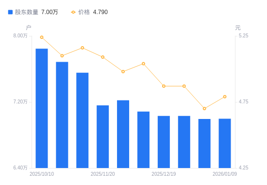 1月12日消息,数据显示,截至2026年1月9日,韶能股份A股股东总户数为7万户,较上期(2025年12月31日)增加29户,增幅0.04%。公司最新A股总股本为10.64亿股,其中流通A股10.5亿股,户均持有流通A股数量为1.5万股,较上期减少6.22股,降幅0.04%;户均持流通A股市值7.19万元,较上期增加1320.79元,增幅1.87%。