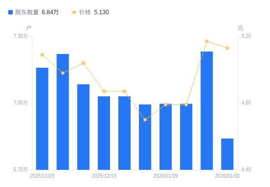 2月3日消息,数据显示,截至2026年1月30日,韶能股份A股股东总户数为6.84万户,较上期(2026年1月20日)减少3912户,降幅5.41%。公司最新A股总股本为10.64亿股,其中流通A股10.5亿股,户均持有流通A股数量为1.53万股,较上期增加829.97股,增幅5.72%;户均持流通A股市值7.87万元,较上期增加3677.25元,增幅4.90%。
