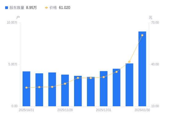 近一年(2025年2月10日至2026年1月30日),盛达资源A股股东户数从2.89万户,增加至8.95万户,增幅209.35%,区间股价上涨337.42%。