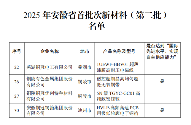 日前,安徽省工业和信息化厅公布了2025年安徽省首批次新材料(第二批)名单。铜陵有色(000630)集团下辖的4个子公司——铜陵有色金属集团股份有限公司产品“磁控超细晶高均匀超低无氧铜带”、铜陵铜冠优创特种材料有限公司产品“5N级TGYC-GC01高纯致密铢粒”、安徽铜冠铜箔(301217)集团股份有限公司产品“HVLP-高频高速 PCB用极低轮廓电子铜箔”、芜湖铜冠电工有限公司产品“1UEWF-HBVO1超薄漆膜高耐压电磁线”成功入选。