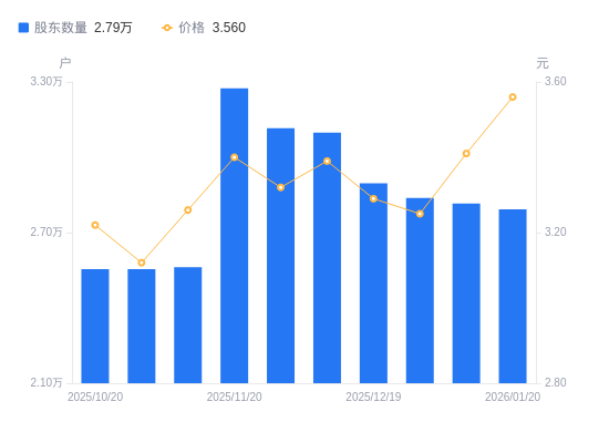 近一年(2025年1月20日至2026年1月20日),顺发恒能A股股东户数从3.16万户,减低至2.79万户,降幅11.71%,区间股价上涨14.47%。