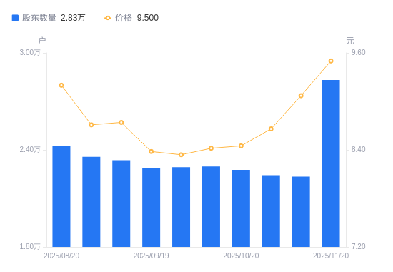 近一年(2024年11月20日至2025年11月20日),英力特A股股东户数从2.72万户,增加至2.83万户,增幅3.98%,区间股价上涨11.24%。