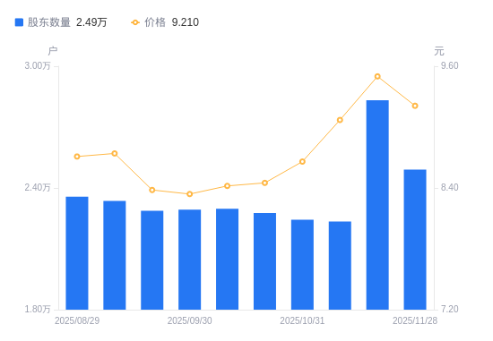 近一年(2024年12月10日至2025年12月10日),英力特A股股东户数从2.72万户,减低至2.29万户,降幅15.69%,区间股价上涨10.96%。