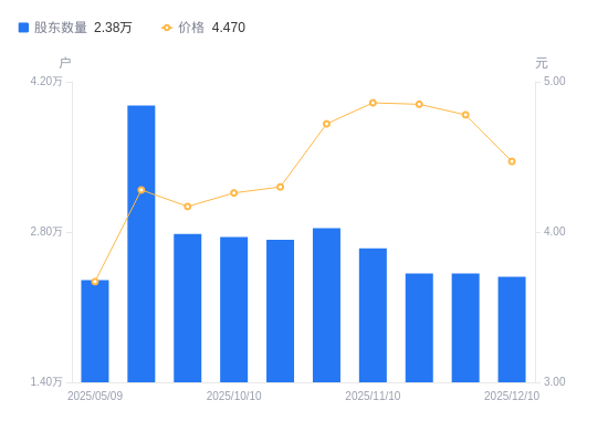 近一年(2024年12月31日至2025年12月19日),茂化实华A股股东户数从2.29万户,增加至2.37万户,增幅3.88%,区间股价上涨18.23%。