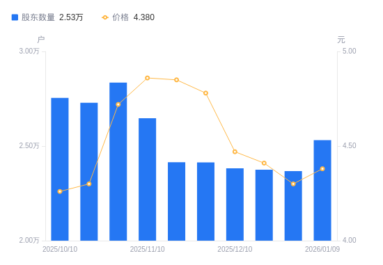 1月12日消息,数据显示,截至2026年1月9日,茂化实华A股股东总户数为2.53万户,较上期(2025年12月31日)增加1632户,增幅6.89%。公司最新A股总股本为5.2亿股,其中流通A股3.65亿股,户均持有流通A股数量为1.44万股,较上期减少992.76股,降幅6.45%;户均持流通A股市值6.31万元,较上期减少3116.55元,降幅4.71%。