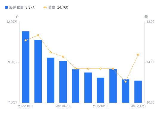 近一年(2024年11月29日至2025年11月28日),襄阳轴承A股股东户数从3.84万户,增加至8.37万户,增幅117.63%,区间股价上涨155.81%。