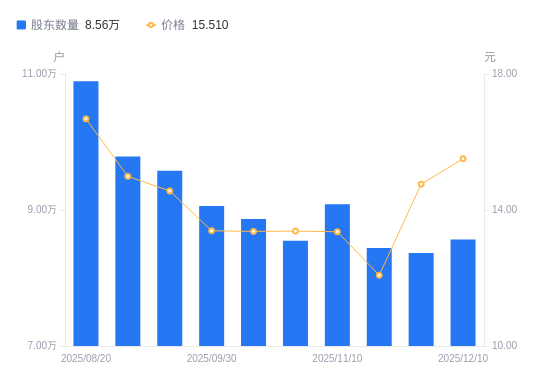 近一年(2024年12月20日至2025年12月19日),襄阳轴承A股股东户数从4.01万户,增加至9.85万户,增幅145.73%,区间股价上涨122.21%。