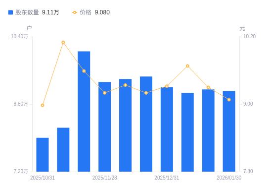 近一年(2025年2月10日至2026年1月30日),东北证券A股股东户数从8.66万户,增加至9.11万户,增幅5.27%,区间股价上涨15.96%。