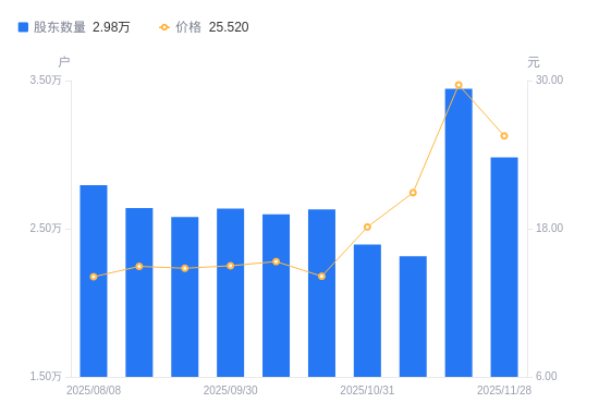 12月2日消息,数据显示,截至2025年11月10日,国城矿业A股股东总户数为2.31万户,较上期(2025年10月31日)减少794户,降幅3.32%。公司最新A股总股本为11.25亿股,其中流通A股11.25亿股,户均持有流通A股数量为4.86万股,较上期增加1613.83股,增幅3.43%;户均持流通A股市值101.76万元,较上期增加16.45万元,增幅19.28%。