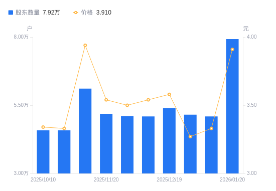 近一年(2025年1月27日至2026年1月20日),新能泰山A股股东户数从4.36万户,增加至7.92万户,增幅81.67%,区间股价上涨30.33%。