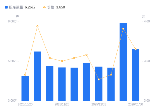 近一年(2025年2月20日至2026年1月30日),新能泰山A股股东户数从4.4万户,增加至6.26万户,增幅42.19%,区间股价上涨16.99%。