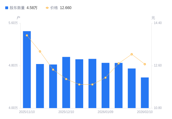 近一年(2025年2月10日至2026年2月10日),湖南发展A股股东户数从4.95万户,减低至4.58万户,降幅7.47%,区间股价上涨32.29%。