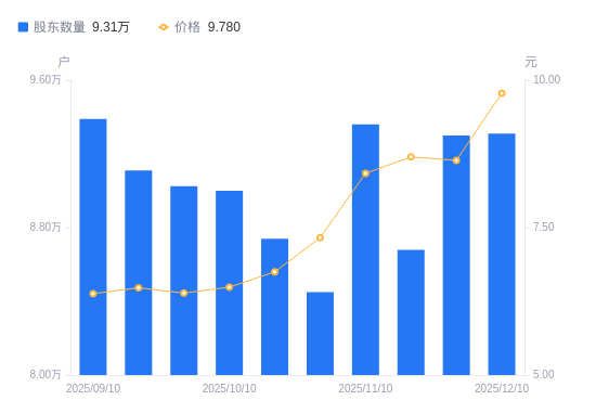 12月11日消息,数据显示,截至2025年12月10日,罗牛山A股股东总户数为9.31万户,较上期(2025年11月28日)增加100户,增幅0.11%。公司最新A股总股本为11.52亿股,其中流通A股11.51亿股,户均持有流通A股数量为1.24万股,较上期减少13.29股,降幅0.11%;户均持流通A股市值12.09万元,较上期增加1.4万元,增幅13.07%。