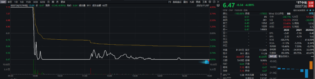 11月7日,*ST中地(000736)(000736)止步“五连板”。今日早盘,该股一度以涨停价开盘,但在涨停板停留不足半小时便直线跳水并触及跌停,上演“天地板”。