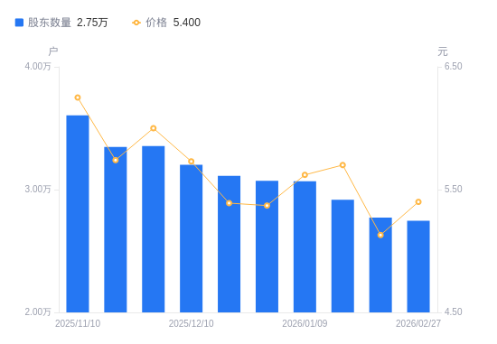3月3日消息,数据显示,截至2026年2月27日,*ST中地A股股东总户数为2.75万户,较上期(2026年2月13日)减少254户,降幅0.92%。公司最新A股总股本为7.47亿股,其中流通A股7.47亿股,户均持有流通A股数量为2.72万股,较上期增加249.22股,增幅0.92%;户均持流通A股市值14.69万元,较上期增加8622.48元,增幅6.24%。