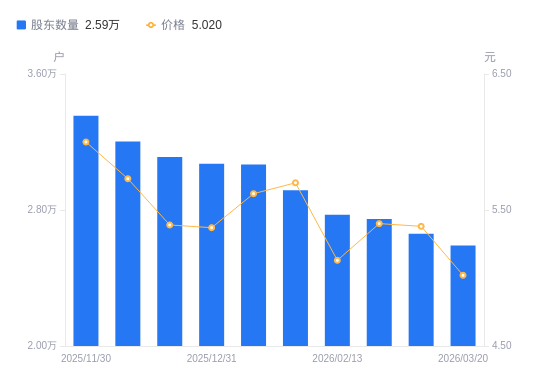 近一年(2025年3月20日至2026年3月20日),*ST中地A股股东户数从5.3万户,减低至2.59万户,降幅51.07%,区间股价下跌19.68%。
