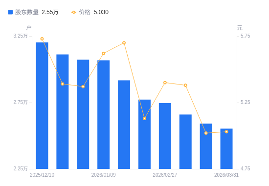 近一年(2025年3月31日至2026年3月31日),*ST中地A股股东户数从5.09万户,减低至2.55万户,降幅49.89%,区间股价下跌6.16%。