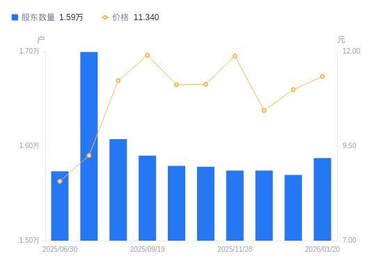 1月22日消息,数据显示,截至2026年1月20日,ST西发A股股东总户数为1.59万户,较上期(2025年12月31日)增加178户,增幅1.13%。公司最新A股总股本为2.64亿股,其中流通A股2.64亿股,户均持有流通A股数量为1.66万股,较上期减少188.45股,降幅1.12%;户均持流通A股市值18.84万元,较上期增加3744.77元,增幅2.03%。