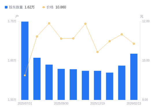 2月25日消息,数据显示,截至2026年2月13日,ST西发A股股东总户数为1.62万户,较上期(2026年1月20日)增加303户,增幅1.91%。公司最新A股总股本为2.64亿股,其中流通A股2.64亿股,户均持有流通A股数量为1.63万股,较上期减少311.26股,降幅1.87%;户均持流通A股市值17.71万元,较上期减少1.14万元,降幅6.03%。