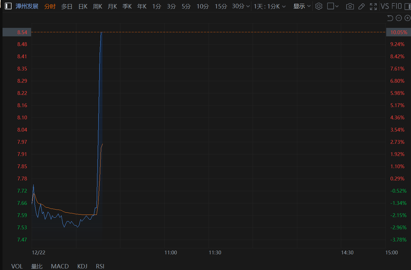 格隆汇12月22日|A股漳州发展直线拉升封涨停板,报8.54元。福建漳州“十五五”规划建议提出,着力深化漳台“五大板块”融合打造两岸融合发展先行城市。