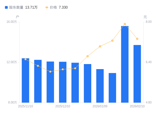 近一年(2025年2月10日至2026年2月10日),中色股份A股股东户数从10.42万户,增加至13.71万户,增幅31.66%,区间股价上涨46.48%。